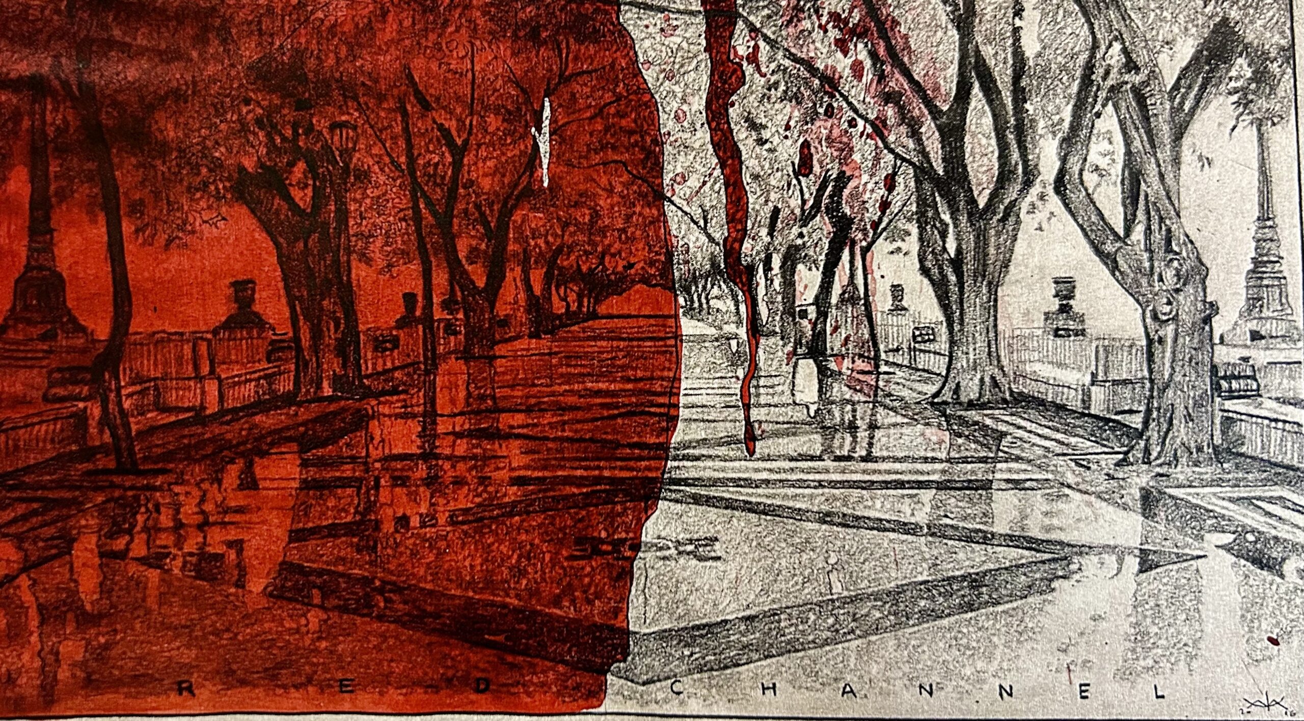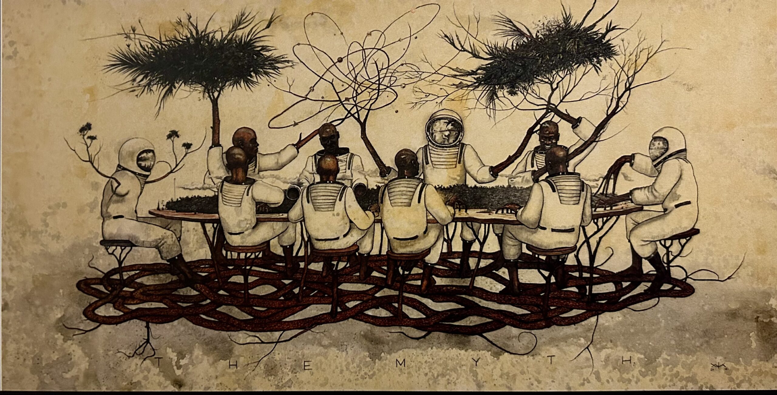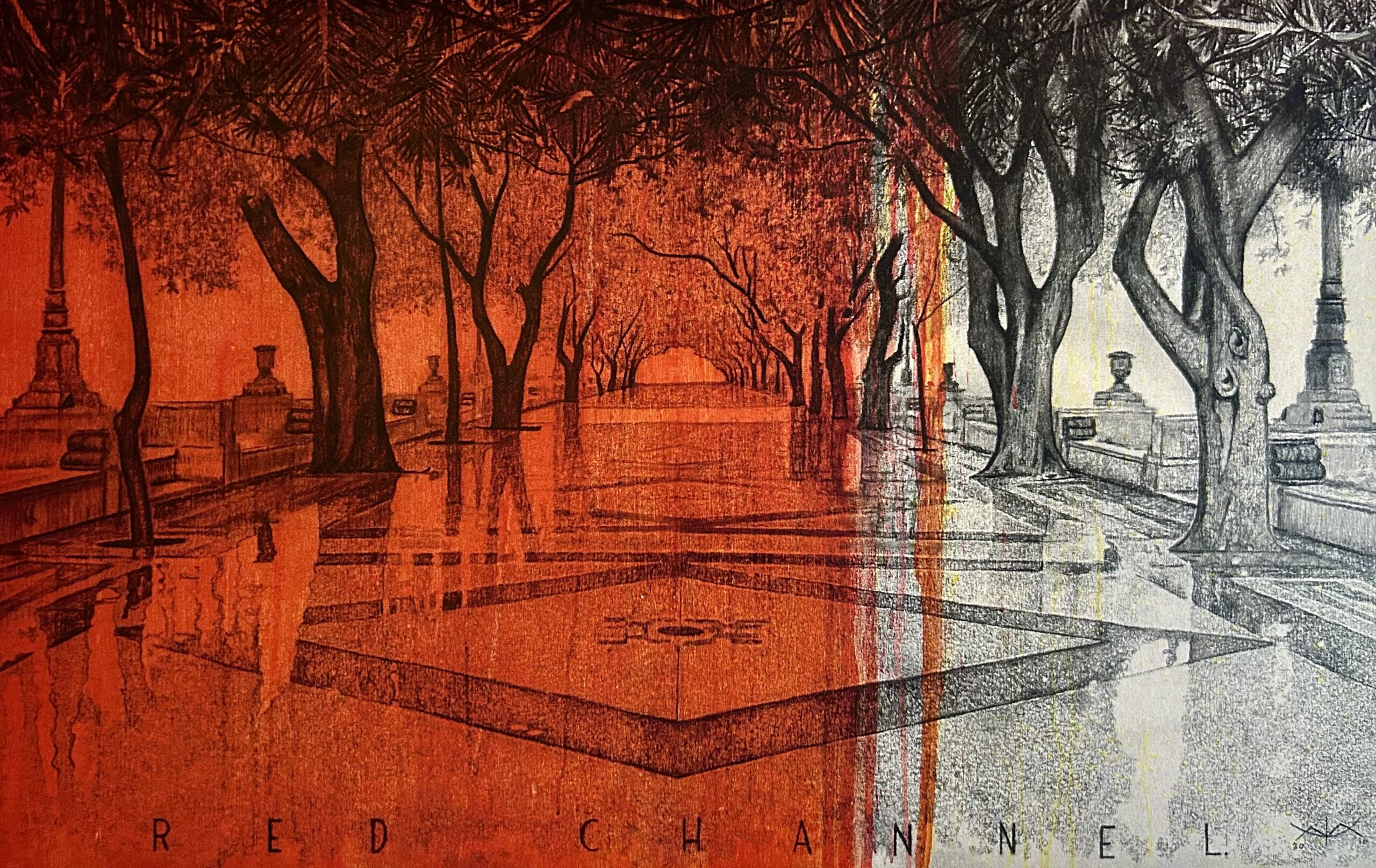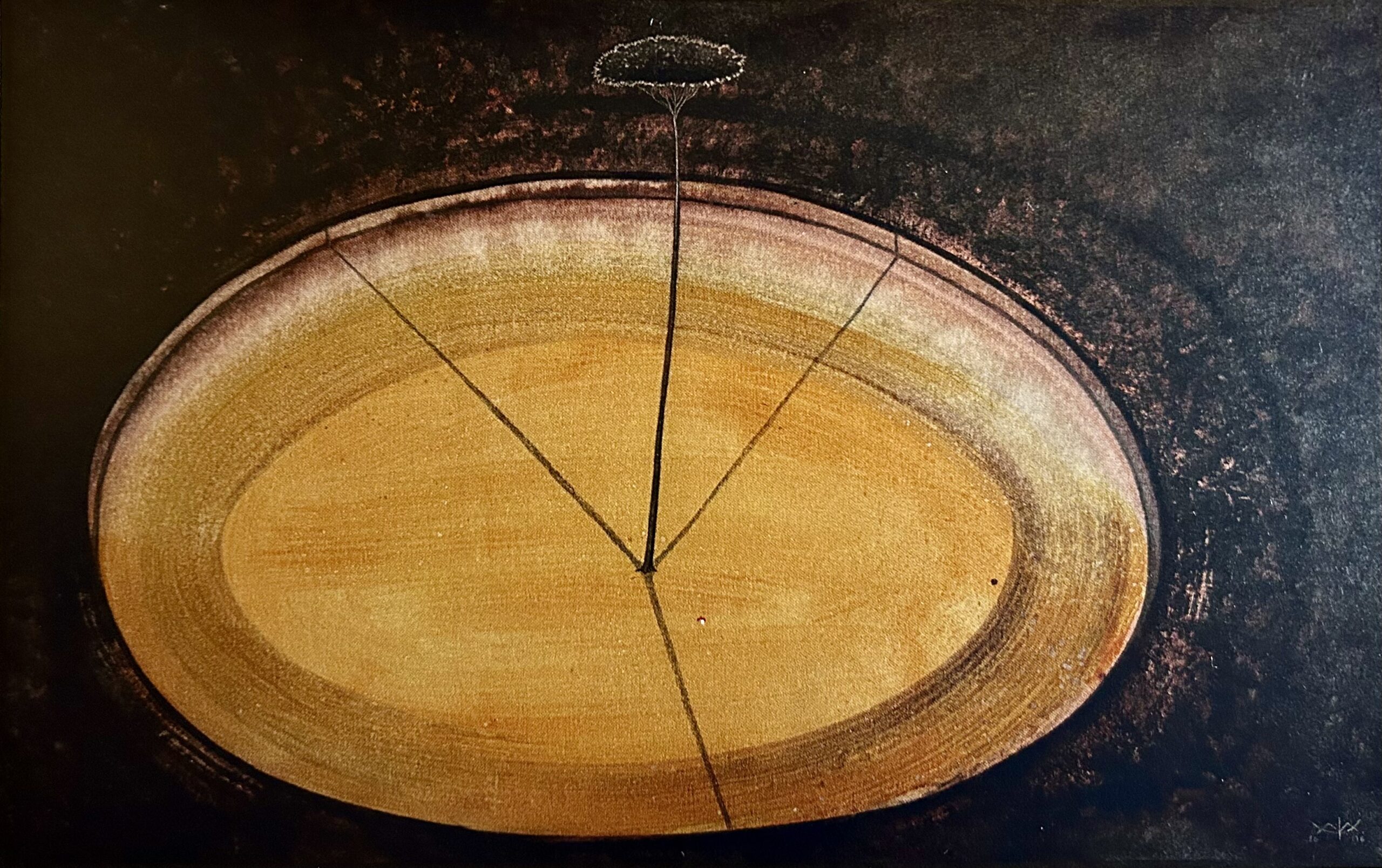 Este círculo dorado está suspendido sobre un bosque que arde y se disuelve.